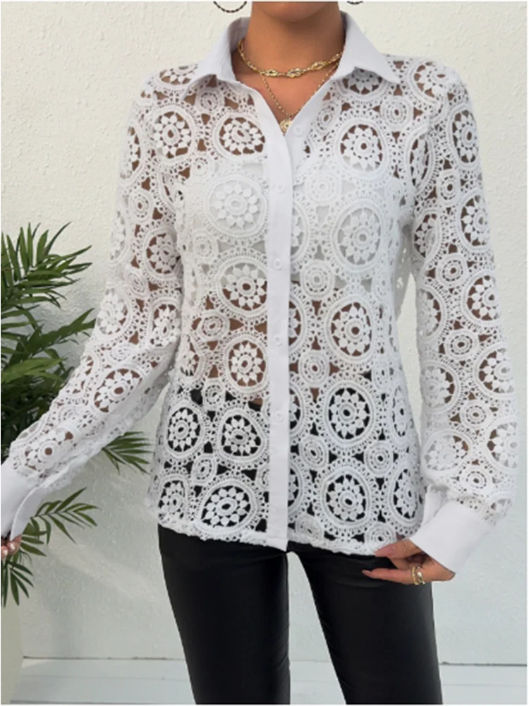 Lace Long Sleeved Solid Color V-neck Women's Shirt Elegant Versatile Daily Office Commuting Style Spring Top