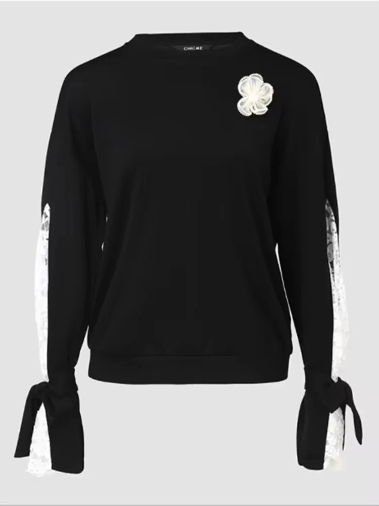 Three-dimensional Flower Splicing Lace Flare Long Sleeve T-shirt Women's Fashion Elegant Autumn Top