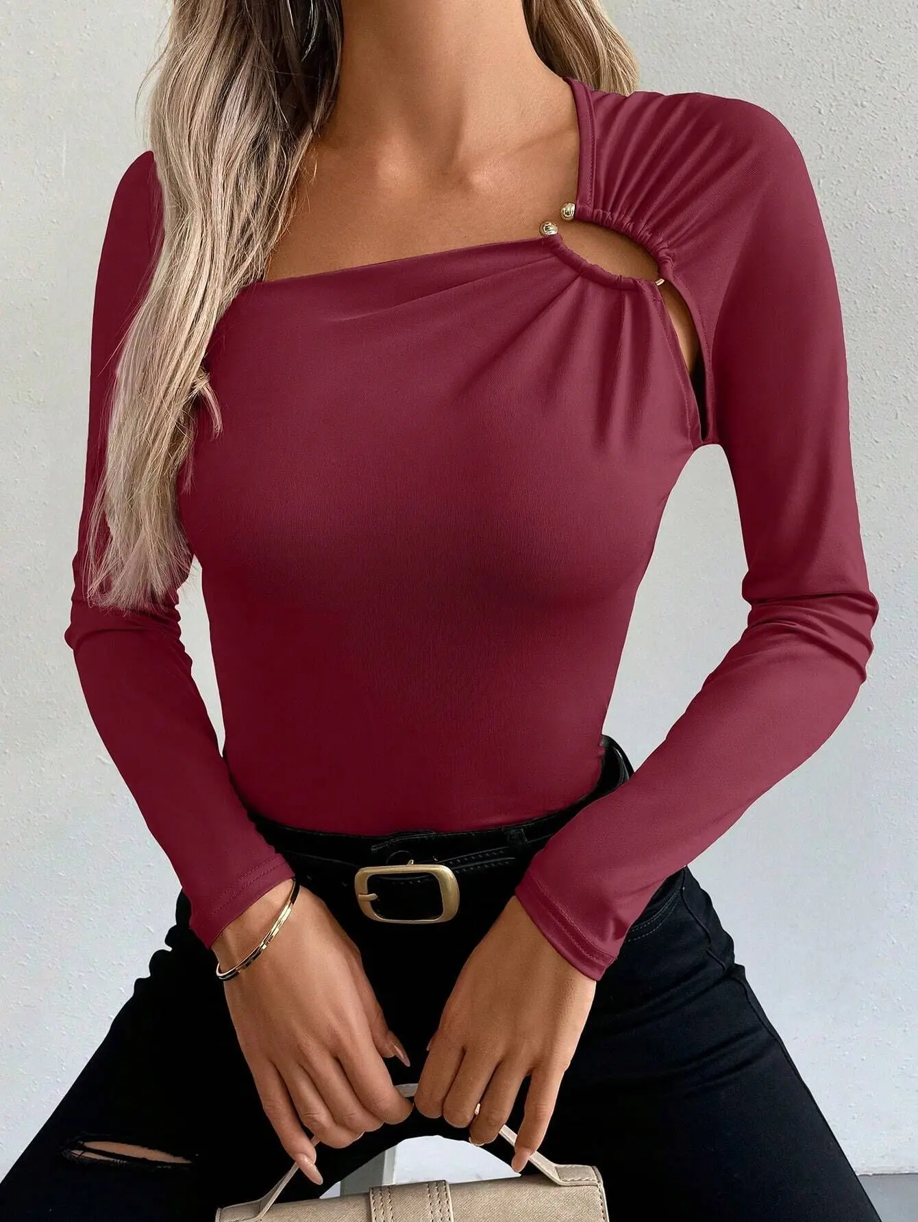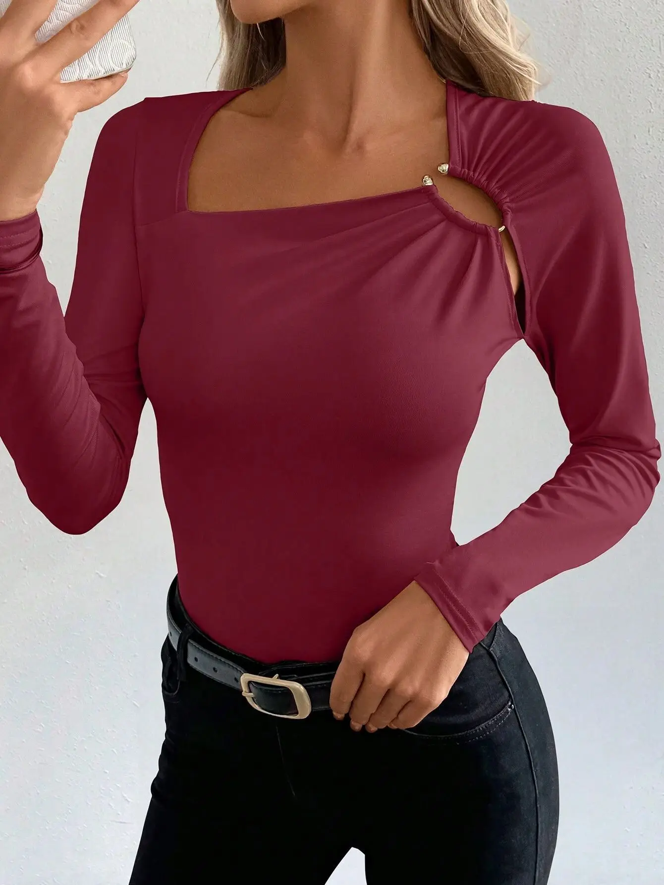 Woman Casual Square Neck Top Cut Out Eyelet Detail Long Sleeves Bodycon Seasonal Transitions Street Fashion Stylish Wear