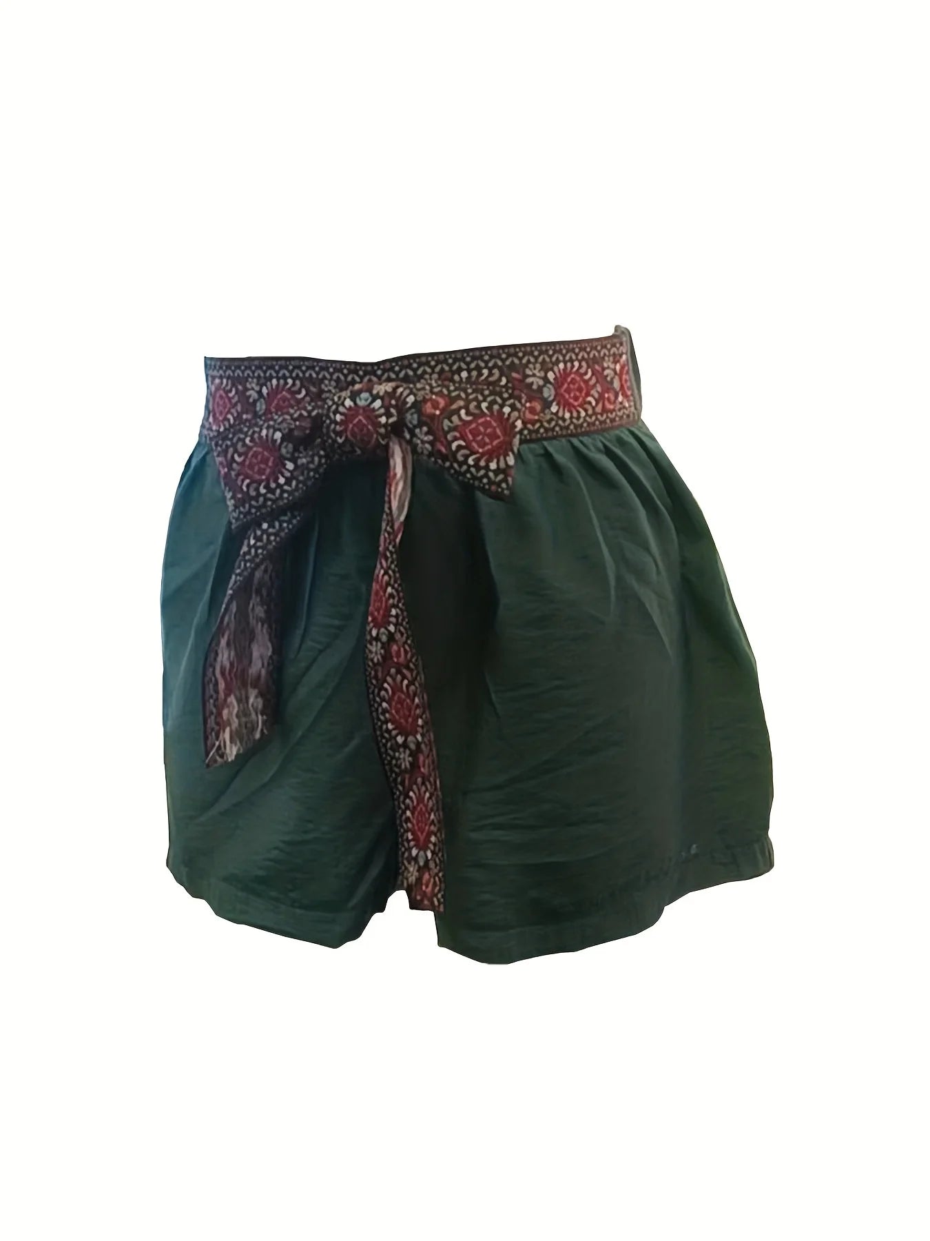 Women's Green Linen Shorts Embroidered Belt with Bow Ideal for Beach Vacations Bohemian Trips Casual Summer Styles