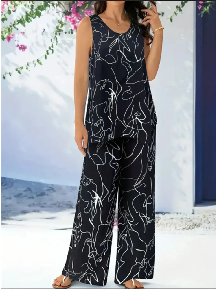 Women's Sleeveless Vest Straight Leg Pants Set Female Printed Black Sleeve Loose Pants Trendy Summer Casual Set